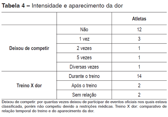 Ao se relacionar o aparecimento da dor com o período de treinamento, em 13 (72,22%) casos o pico da dor ocorreu durante o treinamento, duas atletas (11,1%) disseram sentir dor logo após o treino e três atletas (16,66%) não relacionaram o aparecimento da dor com o treinamento imediato (Tabela 4). A intensidade da dor é um parâmetro muito subjetivo. Para fim de estudo comparativo usou-se o número de competições esportivas das quais as atletas deixaram de participar devido a dores.