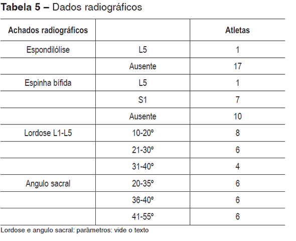A seguir, foi realizada avaliação radiográfica das atletas com ênfase na determinação dos parâmetros anatômicos e patológicos, resumidos na Tabela 5. O ângulo de lordose no exame radiográfico variou de 10° a 40°, média de 23°83' pelo método de Cobb (linha tangente ao platô superior de L1 e linha inferior da superfície articular de L5; ângulo de lordose é igual ao ângulo formado pelo cruzamento das perpendiculares dessas linhas). O ângulo sacral situou-se entre 20° e 55°, com média de 37°33'. A incidência sacral esteve dentro de 5° a 32° (média: 22°50').