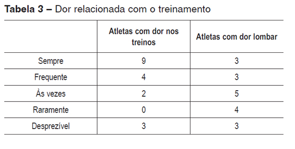 Quando especificada a região lombar como sede de dor limitante, três ginastas (16,66%) referiram dor em todos os treinos, três atletas (16,66%) com dores frequentes, cinco ginastas (27,77%) relataram dor lombar ocasional, quatro (22,22%) referiram dor lombar em raras ocasiões e três (16,66%) não apontaram a coluna como sede importante de dor (Tabela 3).