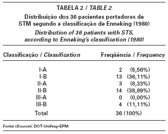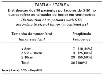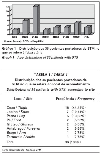 Foram analisados 93 pacientes portadores de STM, no período de maio de 1983 a dezembro de 1997, matriculados no Setor de Tumores Músculo-Esqueléticos do Hospital São Paulo, pertencente à Universidade Federal de São Paulo - Escola Paulista de Medicina. Dentre eles estudamos 36, que apresentavam todos os dados necessários à análise do presente estudo. O tempo de seguimento foi de quatro a 175 meses, com média de 42 meses.