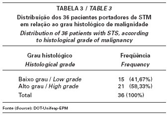 3) O risco de desenvolver metástases para os pacientes portadores de STM de alto grau de malignidade histológica é significante em relação aos STM de baixo grau. Portanto, é um fator prognóstico importante no manuseio dos pacientes portadores de STM.