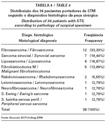 O diagnóstico histológico definitivo dos STM teve como maior incidência o fibrossarcoma, com 12 (33,33%) casos, seguido do sarcoma sinovial, com sete (19,44%) casos e do lipossarcoma, com seis (16,67%) casos (tabela 4).