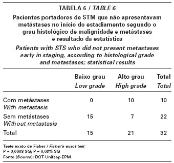 Na tabela 6 apresentamos os resultados dos pacientes que tinham baixo e alto grau de malignidade histológica em relação à ocorrência posterior de metástases. Não incluímos os pacientes estadiados como grau III quando da consulta inicial, pois, pela classificação adotada, a presença de metástase, por definição, caracteriza este grupo.