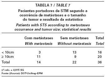 A análise da casuística que estudamos mostra significante relação entre o grau histológico de malignidade e a ocorrência de metástases (tabela 6). Concordamos com os vários autores que consideraram o grau histológico de malignidade como o mais importante fator prognóstico para os pacientes portadores de STM(4,5,8,14,16).