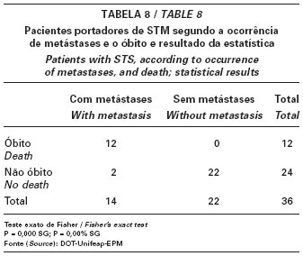 A tabela 8 demonstra pela análise estatística que a presença de metástase apresenta relação significante com o óbito. Pode parecer uma afirmação óbvia, mas com os atuais avanços no campo dos estudos dos tumores malignos, a ocorrência de metástases por si só não é mais um fator que possa ser considerado isoladamente como de mau prognóstico sem um estudo adequado.